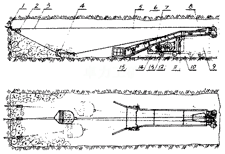 安裝使用示意圖↑1、固定楔 2、尾輪 3、鋼絲繩 4、耙斗 5、簸箕口 6、連接槽 7、中間槽 8、卸載槽 9、礦車 10、軌道 11、導(dǎo)向輪 12、操縱機構(gòu) 13、絞車 14、臺車 15、升降裝置 |