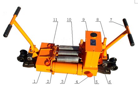 主要結(jié)構(gòu)如圖:1前夾具體、2活塞桿、3油缸、4回油閥(另一側(cè)為備用回油閥)、5后夾具體、6斜鐵(6塊)、7扳把、8油泵搖桿、9油箱、10復(fù)位彈簧、11小安全銷(2個(gè))。㈡工作原理:增大軌縫時(shí),使用前夾具體1與后夾具體5,通過(guò)四個(gè)柱塞泵將液壓油壓入雙油缸中,活塞2向外伸出,前、后夾具體中的斜鐵夾住兩條鋼軌后,推動(dòng)鋼軌使兩條鋼軌間的縫隙增大,從而達(dá)到調(diào)整軌縫的目的。四、使用方法和保養(yǎng)正確的使用與保養(yǎng),對(duì)保證機(jī)具的正常工作和延長(zhǎng)其使用壽命具有重要作用,操作者應(yīng)認(rèn)真閱讀本說(shuō)明書,以了解各部結(jié)構(gòu)和作用。㈠、使用前檢查1、油箱內(nèi)油面高度是否達(dá)到油箱高度的2/3,夏季使用40#機(jī)油,冬季使用20#機(jī)油,加油時(shí)應(yīng)過(guò)濾。2、操縱部分是否靈活可靠。3、回油閥啟閉是否正常,各液壓件工作是否正常。4、各連接緊固部位是否松動(dòng)和有無(wú)漏油現(xiàn)象。㈡、操作步驟1、將機(jī)具置于被調(diào)整的兩根鋼軌接頭處,使軌縫位于前夾具體1與后夾具體5之間。2、向下搬動(dòng)夾具體上的操縱扳把7使夾具體落在鋼軌上。3、順時(shí)針旋緊回油閥4,用操縱桿搖動(dòng)油泵搖桿8,使液壓油輸入工作油缸3中,當(dāng)活塞2伸長(zhǎng)20mm后,斜鐵則可夾住鋼軌,繼續(xù)搖動(dòng)操縱桿即能達(dá)到調(diào)整軌縫作業(yè)目的。4、每次軌縫調(diào)整完畢應(yīng)按逆時(shí)針?lè)较蛳刃_(kāi)回油閥,然后向上搬動(dòng)扳把7松開(kāi)斜鐵,使工作油缸活塞在拉簧作用下復(fù)位,即完成一次工作循環(huán)。(本機(jī)設(shè)有兩個(gè)回油閥,當(dāng)其中一個(gè)出故障時(shí),打開(kāi)另一個(gè)回油閥,即可使油缸復(fù)位,提高了本機(jī)的安全性能。)5、完成作業(yè)后,向上搬動(dòng)各夾具體上的扳把7,通過(guò)棘爪將走行輪落在鋼軌面上,推行至下一軌縫處或整機(jī)下道。6、油箱內(nèi)設(shè)有溢流閥,其壓力在出廠前已調(diào)整至52MPa,當(dāng)負(fù)載過(guò)大時(shí),溢流閥卸荷,從而保證機(jī)具使用安全。㈢故障排除