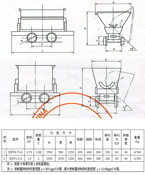 固定式礦車每套均由車箱、車架、緩沖碰頭、輪對(duì)等部件組成,確保成套性;另每臺(tái)礦車配帶插銷2個(gè)。